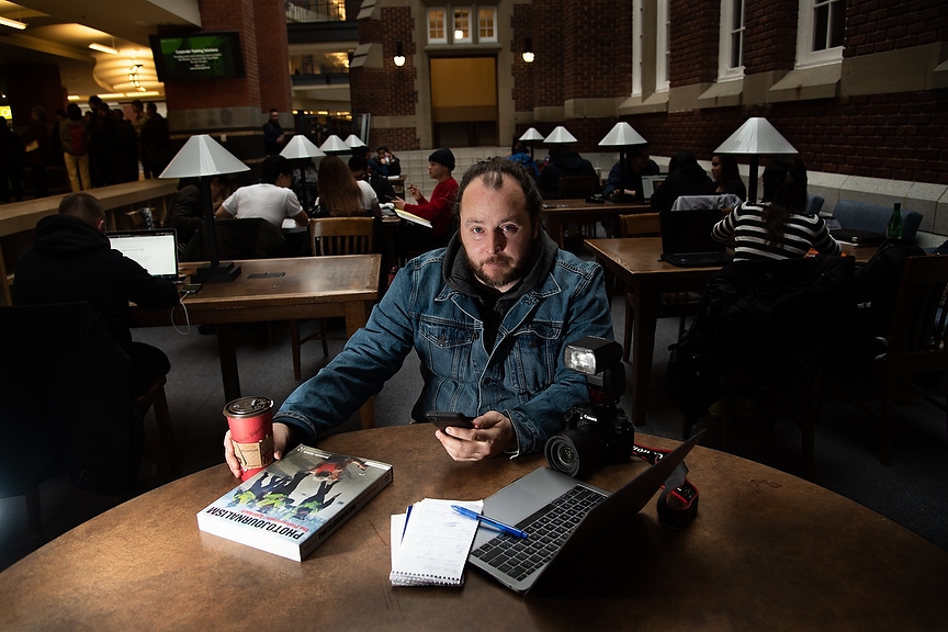 Brandon Peniuk, a SAIT photojournalism student, poses for a photo at Hertiage Hall in Calgary on January 21, 2018. Brandon has ambitions to go on to become a war photographer. (Photo by Jesse Boily/SAIT)