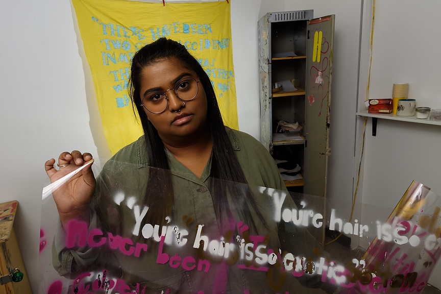 Shamika Singh poses for a portrait in her studio at the Alberta University of the Arts in Calgary on Tuesday, Oct. 29, 2019. Singh describes her work as exploring racial fetishism. In her work, she uses quotes that men have said to her to show the racism fetishes at play. She never intended in her work to be personal but says it just happened this year. In the past year, Singh has begun working with pottery as a medium, which decorates her studio. (Photo by Jesse Boily/The Press)