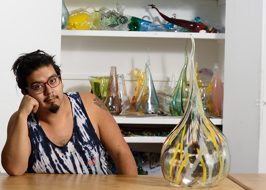 Matias Martinez in hist studio at the Alberta University of the Arts in Calgary on Thursday, Nov. 28, 2019. Martinez is an artist who recently quit his “normal” job to now be a full time artist. He creates art everyday for hours. He has begun practicing advanced glass blowing techniques such as cane rolls where he mixes different colours of glass into one to create pieces like the one on his left. (Photo by Jesse Boily/The Press)