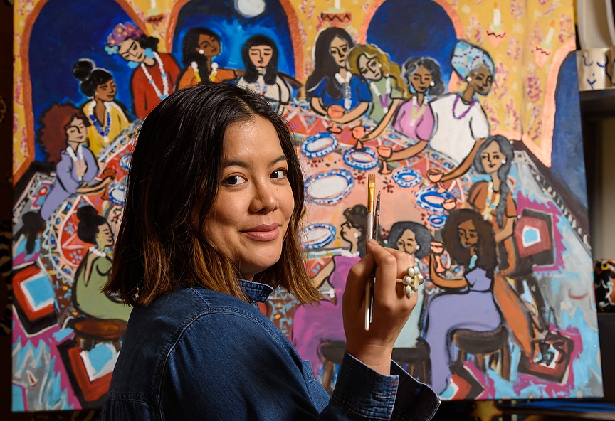 Mikka Caguiat, 20, poses for a portrait in her home studio in Calgary on Friday, Nov. 29, 2019. Caguiat is currently working on a painting for her Grandfather, of her Grandmother, from before the two were dating. The painting is being painted on reclaimed fabric wrapped on a canvases frame. Caguiat plans on applying to the Alberta University of the Arts for the fall. (Photo by Jesse Boily/The Press)