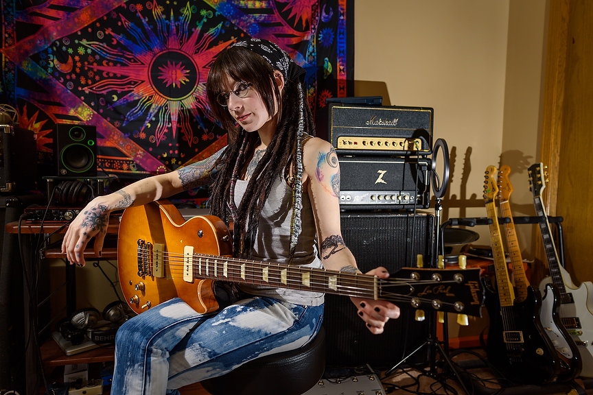Maddison Stellar sits in her home recording studio for a portrait in Calgary on Wednesday, March 11, 2020. Stellar is the lead singer of the band Life Like Fire; sheÕs a mother of two and an entrepreneur. She runs her own Business where she makes creepy dolls and is a motivational speaker for children. (Photo by Jesse Boily/The Press)