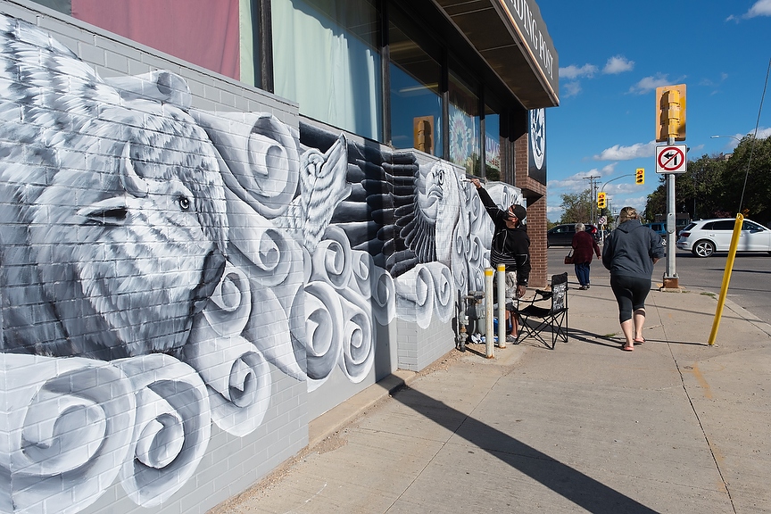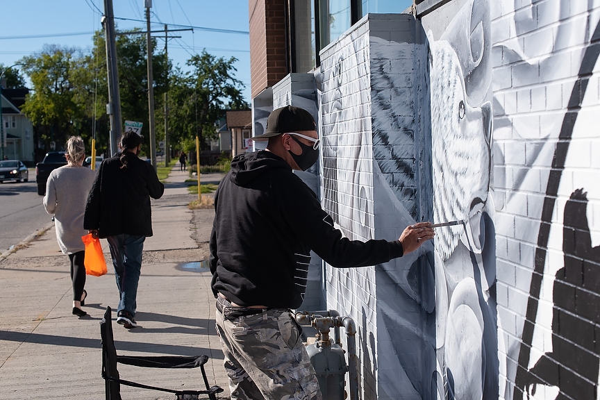 JESSE BOILY / WINNIPEG FREE PRESS Patrick Ross paints a mural at the corner of Main st. and Redwood Ave. on Thursday. Ross has been working on the mural for the past four days about seven hours a day, he says. Thursday, Sept. 3, 2020. Reporter: standup