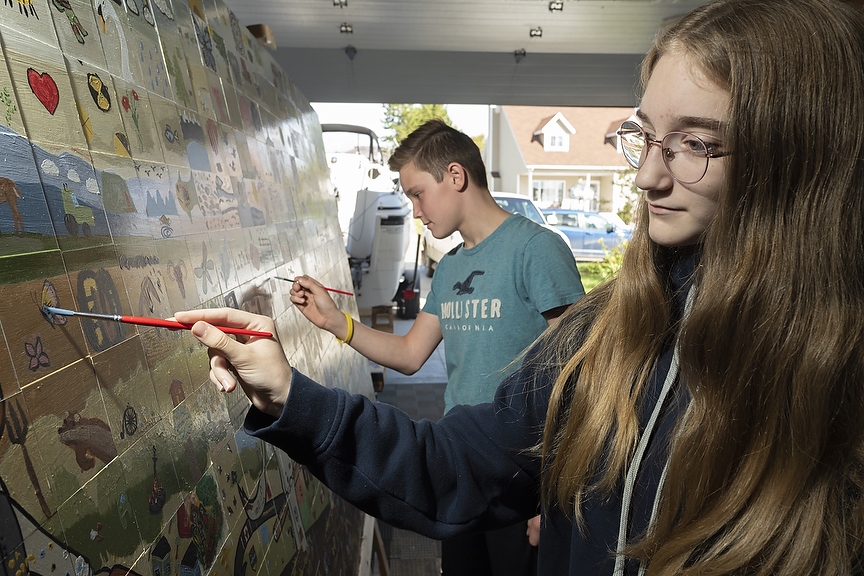 Maya Dyrkach, 11, and Jaxson Longson, 12, work on some finishing touches of the collage mural in Beaverlodge, Alta. on Thursday, Aug. 12, 2021. The two grade seven students were among over a 100 students who painted squares to make the mural which will be presented to the public on Sept. 11. (Photo by Jesse Boily)