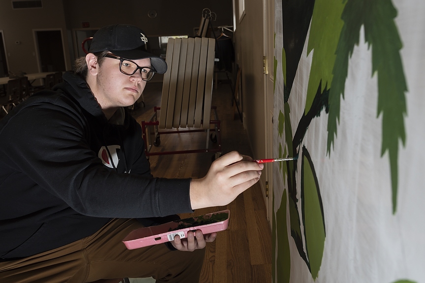 Micheal Roberts, Beaverlodge Mural Society’s summer student, was busy painting a mural that will be on display at the Beaverlodge Art Walk on June 10. Photo taken in Beaverlodge, Alta. on Monday, May 9, 2022. (Photo by Jesse Boily)