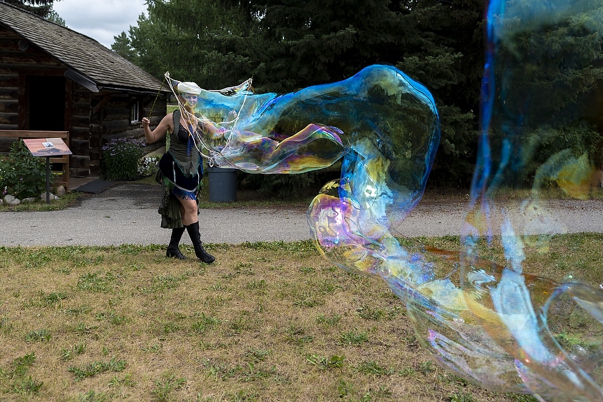 Marcia Tofer made bubbles at the Heritage Day celebrations at the Grande Prairie Museum in Grande Prairie, Alta. on Saturday, July 30, 2022. The festival had cultural booths, artists live painting, cultural dances, and carnival games. (Photo by Jesse Boily)
