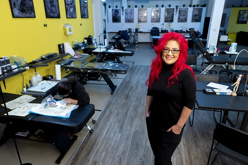 Bobbi-Jo Matheson, owner and operator, stops for a portrait at her school at the Alberta College of Body Arts in Grande Prairie, Alta. on Monday, Aug. 29, 2022. The school is Canada's first and only provincially licensed post secondary tattoo school. The six month program being licensed allows students access student loans provincially and federally. (Photo by Jesse Boily)