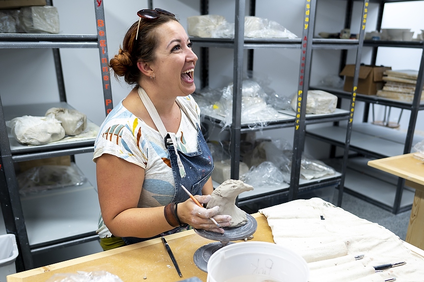 Tia Stanway works on a bird sculpture during the announcement of Alberta Culture Days at the Centre for Creative Arts in Grande Prairie, Alta. on Tuesday, Aug. 30, 2022. The centre was named as a feature celebration site from the province. Free arts programming will be available throughout the city for the month of September. (Photo by Jesse Boily)