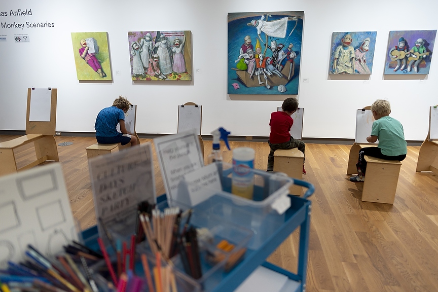 Noah Woolfrey draws some sock monkeys while Nathan Woolfrey and Owen Griffiths discuss the painting at the sketch party part of Alberta Culture Days at the Art Gallery of Grande Prairie in Grande Prairie, Alta. on Saturday, Sept. 17, 2022. The AGGP invited guests to come and sketch the current exhibitions and provided sketch pads and drawing material. The province says approximately $350,000 was distributed to 104 organizations for this year's Culture Days. (Photo by Jesse Boily)