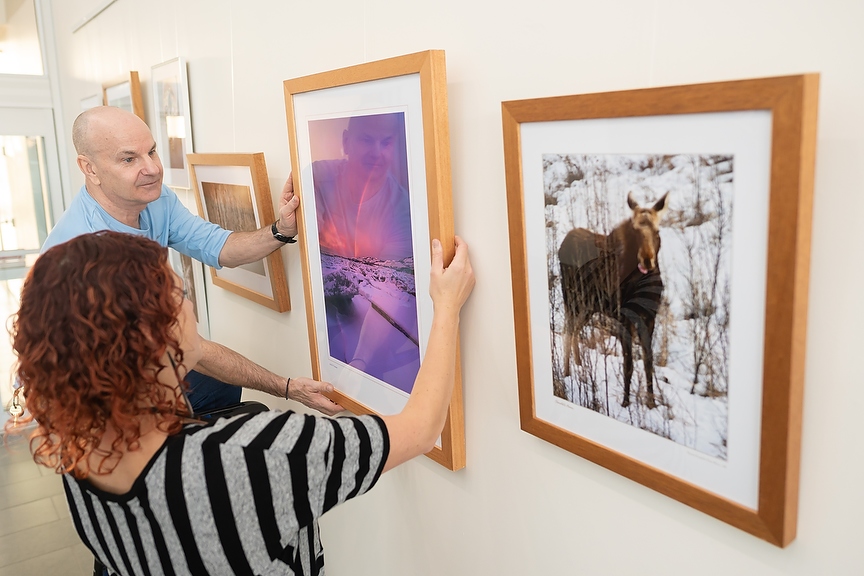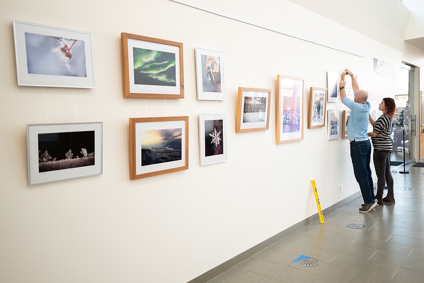 Jamie-Lee Cormier, Traveling Exhibitions Program Northwest curator, and Rob Swanston install the first exhibition “Winter Wonderland” at the Montrose Cultural Centre in Grande Prairie, Alta. on Thursday, Dec. 15, 2022. The new exhibit space is on the Art Gallery of Grande Prairie’s wall. There is currently is a call for artist submissions for the wall. (Photo by Jesse Boily)