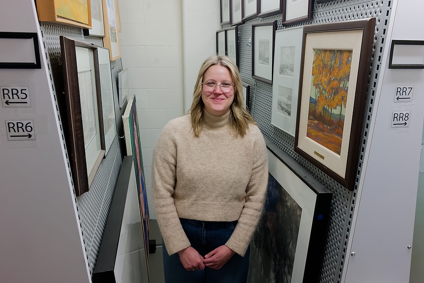 Jessica Groome, Art Gallery of Grande Prairie executive director, stops for a photo with the gallery’s permanent collection at the gallery. The gallery will be closed while the city works on the building housing the gallery. (Photo by Jesse Boily)