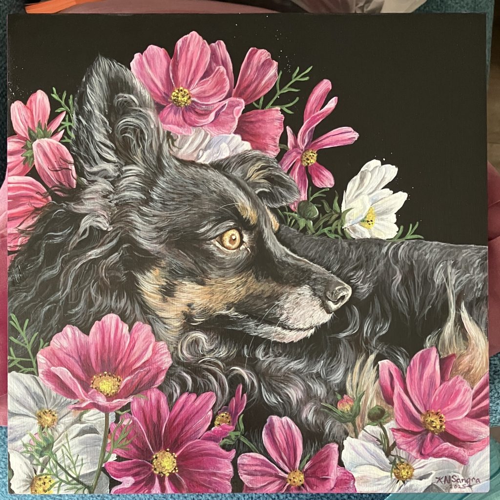 Her shining golden eye likens her to the delicate flowers surrounding her. Figuring out how to paint dark fur and giving a soft and springy feel to the curls was a fun learning process.
